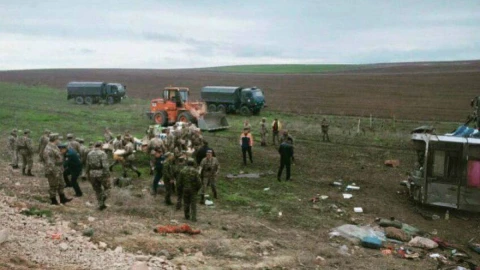 Тас жол бойында артынан келе жатқан автобус осы автокөліктерге соғылмайын деп әрекеттенгенде, жолдан шығып құлап кеткен.