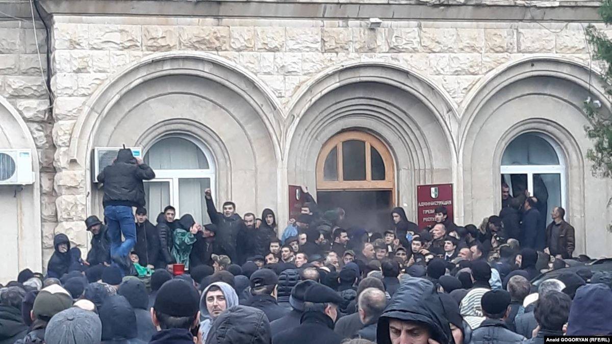 9 қаңтарда өзін мемлекет деп жариялап алған Абхазияда жұрт жаппай наразылыққа шығып, жаңа сайлау өткізуді талап етті. Жүздеген адам Сухум қаласында Абхазия президенті Рауль Хаджимба әкімшілігінің ғимаратына басып кірді. Ғимарат ішіне жиналғандар «Хаджимба, оставкаға кет!» деп айғайлады.