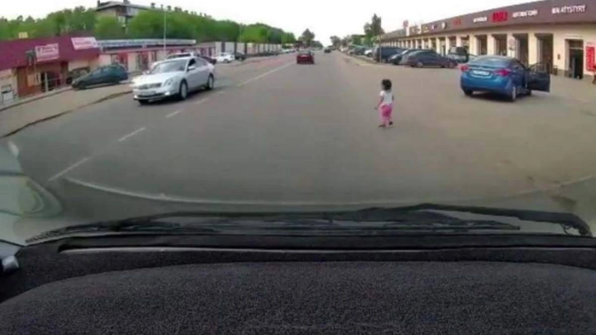 Бұл сәт келе жатқан басқа көліктің бейнежазбасына түсіп қалған. Видеода жеңіл көліктің бұрылып жатқан сәтінде артқы есігі ашылып, баланың жолдың үстіне құлағанын көруге болады. Кішкентай қыз бала құлаған жерінен өзі тұрады. Осы сәтте анасы көліктен шығып, жүгіріп келіп, құшағына алады.