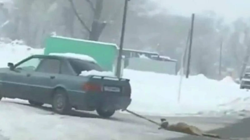 Қазнетте көлікке байланған итті сүйреп жүрген адамдардың видеосы тарады.