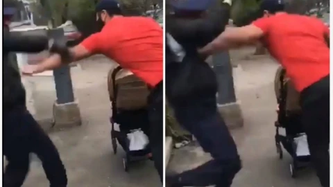 Аталған кадрда учаскелік полиция инспекторы мен ашық-қызғылт түсті футболка киген адам арасындағы қақтығыс көрінеді, онда құқық қорғау органдарының қызметкері азаматтың арбамен жүріп өтуіне рұқсат бермейтін және оны күшпен тоқтатуға тырысатын агрессор ретінде көрсетілген.