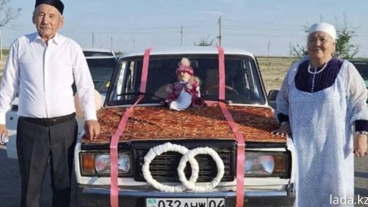 Жаңаөзендік Тұрдыбай Жұмағалиев пен Құралай Әлібекованы 50 жылдық мерейтойын атап өткен. Олар көлікті ерекше әсемдеп, жүзік пен шарлармен, кілем жайып безендірген.