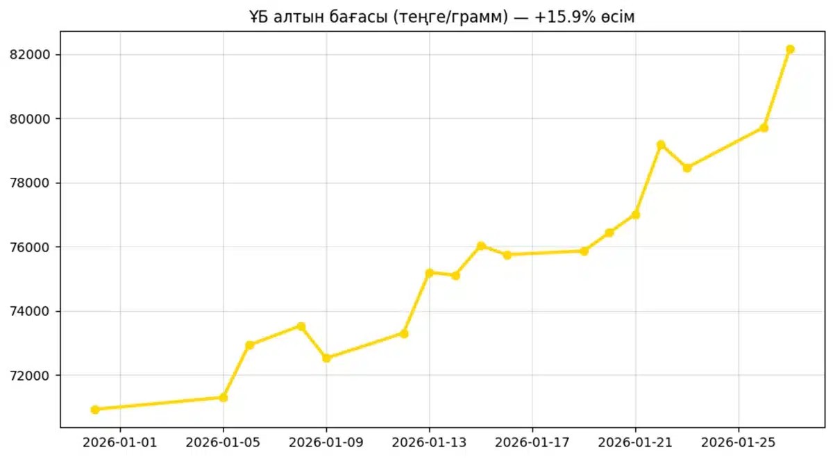 2025 жылдың аяғында ҰБ алтынды шамамен 71 мың теңгемен саудалаған. Содан бері түсті металл шамамен 11 мың теңгеге қымбаттағанын көріп отырмыз. Қазақстанда алтын бағасы бір айға жетпейтін уақытта шамамен 16%-ға қымбаттаған.