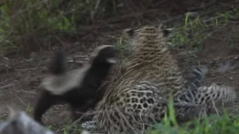 Леопард борсықтың баласын бас салған кезде, күтпеген жерден қарсылыққа тап болды. Ұрғашы борсық оған жан ұшыра шабуылдап, баласына араша түскен. Жекпе-жек бірнеше секундқа ғана созылып, есеңгіреп қалған жыртқыш тез арада ізін суытты.