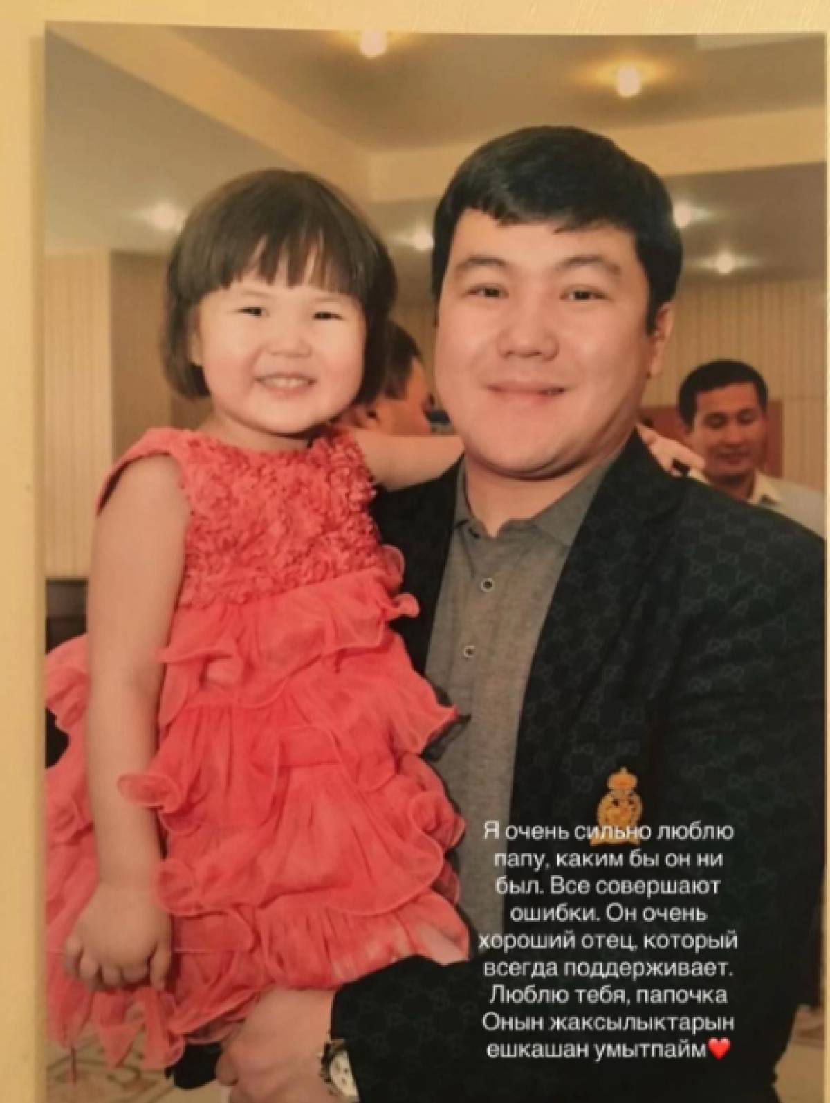 "Әкем туралы жаман сөз айтып, түрлі видео жасауды тоқтатыңыздар. Бұл өмірде ешкім мінсіз емес. Мен әкем қандай болса да, оны қатты жақсы көремін. Барлығы қателеседі. Ол – бізге әрдайым қолдау көрсететін, мейірімді әке. Сені жақсы көремін, әкетайым! Оның жасаған жақсылықтарын ешқашан ұмытпаймын", – деп жазды Айым Тұрсынбекқызы.