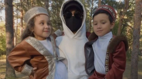 "Бетперде киген адам" бейнебаянында мешіттің ашылғанын жариялап, бұл оқиға "Алла Тағаланың қалауымен" болғанын атап өтті. Кадрда ол ұлттық костюмдер киген ұл мен қызды қолында ұстап тұрғанын көруге болады.