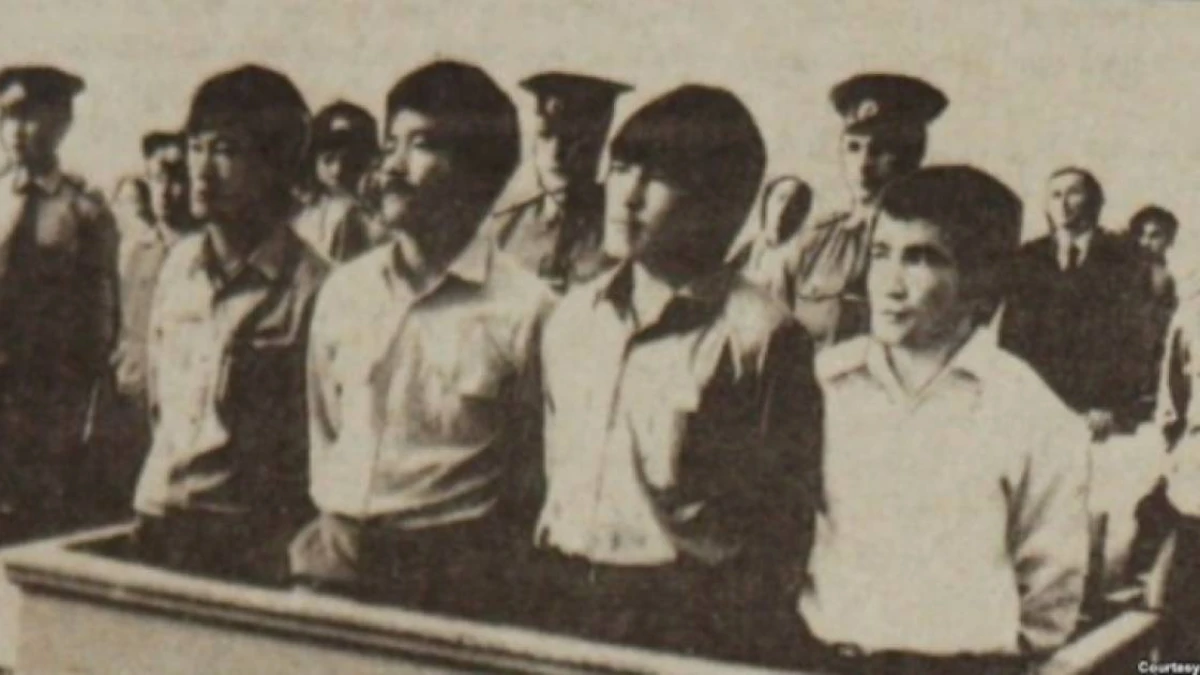 1986 жылғы Желтоқсан көтерілісіне қатысқаны үшін ату жазасына кесілген төртеу (солдан оңға): Ертай Көпесбаев, Түгелбай Тәшенов, Қайрат Рысқұлбеков, Қайыргелді Күзембаев сот үкімін күтіп тұр. Алматы, 16 маусым 1987 жыл. (Юрий Беккер түсірген сурет)