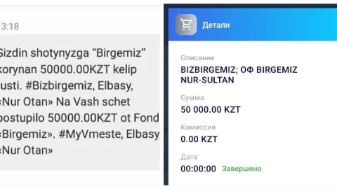"Сіздің шотыңызға 50 000 теңге түсті. #Bizbirgemiz #МыВместе #Елбасы #Nur Otan", - деген жазбасы бар хабарлама 500 мыңнан астам адамға келді.
