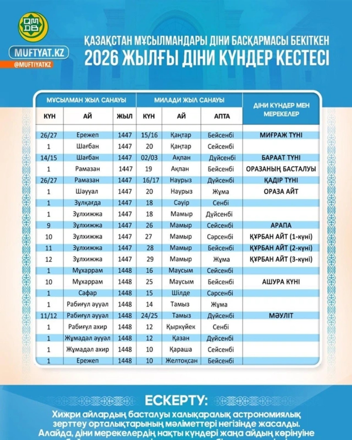 — ҚМДБ-ның шариғат және пәтуа бөлімі 2026 жылға арналған діни күндер күнтізбесін бекітті. Хижра айларының басталуы халықаралық астрономиялық зерттеу орталықтарының деректері негізінде айқындалды. Пәтуа мамандары діни мерекелердің нақты күндері жаңа айды бақылауға байланысты көрсетілген мерзімнен бір күнге ертерек немесе кешірек болуы мүмкін екенін ескертеді, — делінген хабарламада.