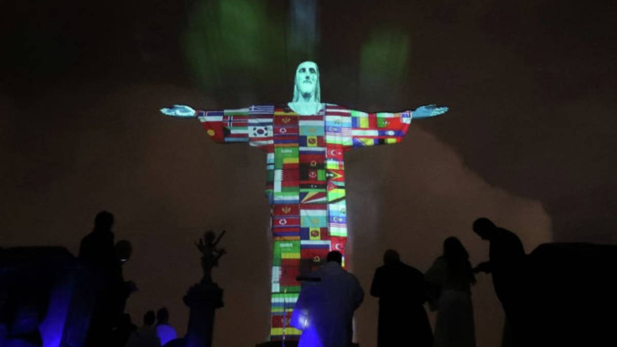 Рио-де-Жанейродағы Жарылқаушы Христос мүсіні коронавируспен күресіп жатқан елдерге қолдау білдіру белгісі ретінде Жер шарының түсімен жарқырады