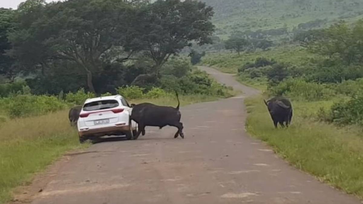 Оңтүстік Африкада қорыққа келушілердің автокөлігіне жабайы енеке (буйвол) тап берді
