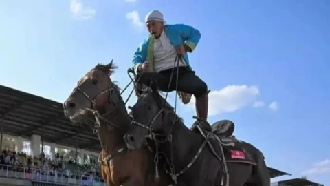 Екі аттың үстінде тік тұрып шапқан қазақ шабандозы әлемдік рекорд орнатты (видео)