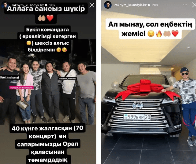 "Аллаға сансыз шүкір! Қырық күнге жалғасқан 70 концерттік ән сапарымызды Орал қаласында аяқтадық. Ал мынау сол еңбектің жемісі", - деп жазды Қуандық Рахым. Суреттен әншінің лентасы шешілмеген су жаңа көлігімен фотоға түскенін де байқауға болады.