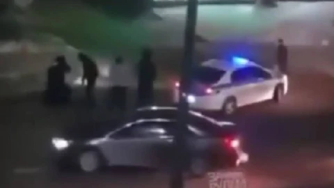 Кадрларда полиция көлігі төбелесіп жатқандарға қарай бара жатып, бұрыла берісте біреуінің аяғын соғып кеткен. Содан кейін тәртіп сақшылары оларды ұстаған.