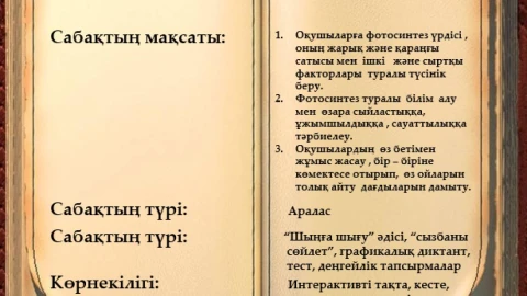 Оқушыларға фотосинтез үрдісі , оның жарық және қараңғы сатысы мен ішкі және сыртқы факторлары туралы түсінік беру.