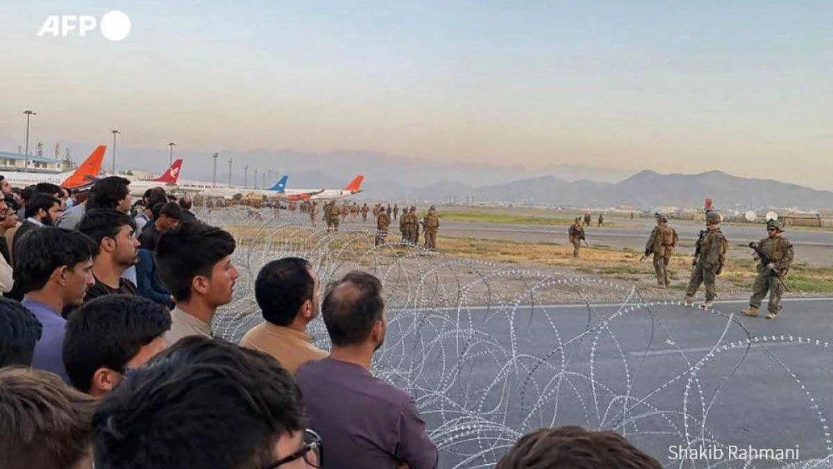 АҚШ әскері Кабул әуежайында Ауғанстаннан эвакуация кезінде тәртіпті қамтамасыз ету үшін ұшу алаңына басып кірген бір топ адамға қарсы аспанға ескерту оқ атты.