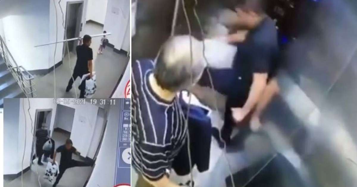 Бала ертке ер адам лифтті тепкілеп, айнаны сындыруға әрекет жасайды.