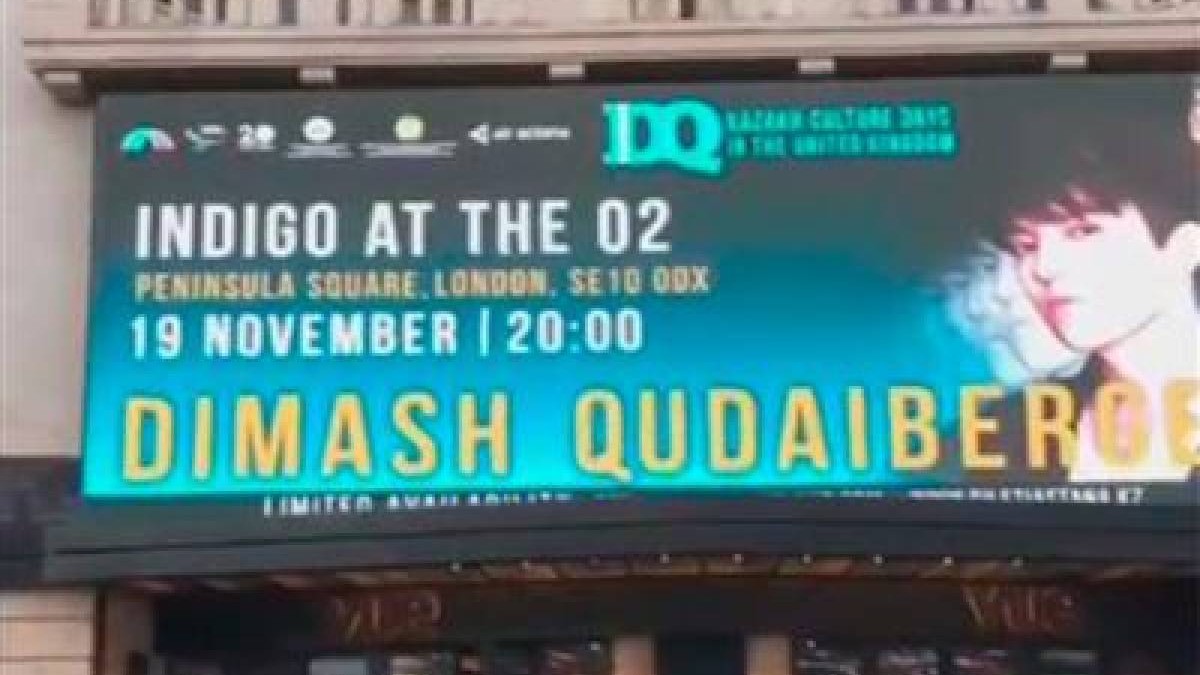 Лондон орталығындағы экрандарда қазақстандық әнші Димаш Құдайбергеннің концертін жарнамаланып жатыр.