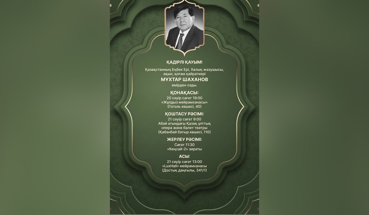 Қазақстанның халық жазушысы, көрнекті ақын әрі қоғам қайраткері Мұхтар Шаханов ертең, 21 сәуір күні Алматыда жерленетін болды, деп хабарлайды kznews.kz.