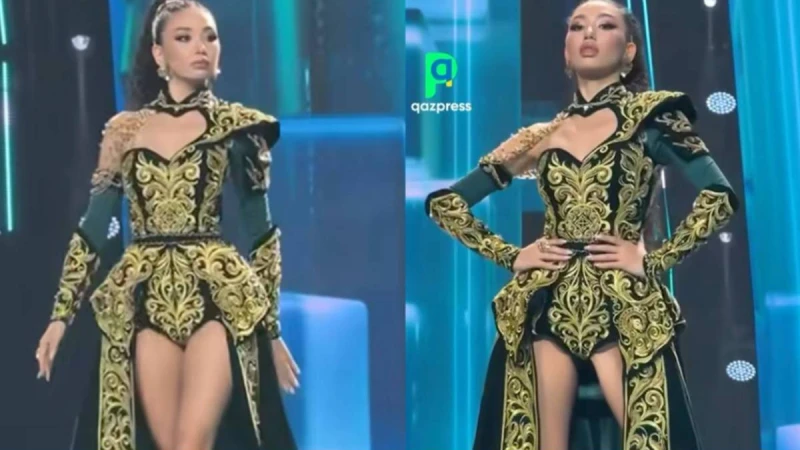 Қазақстан атынан сынға түскен бойжеткен сахнаға дәстүрлі қазақ киімінен шабыт алған жасыл түсті образбен шыққан. Алайда оның пішіні көрермендер арасында түрлі реакция тудырды: дәстүрлі көйлек орнына боди түріндегі киім, арт жағында ұзын етек бекітілген.
