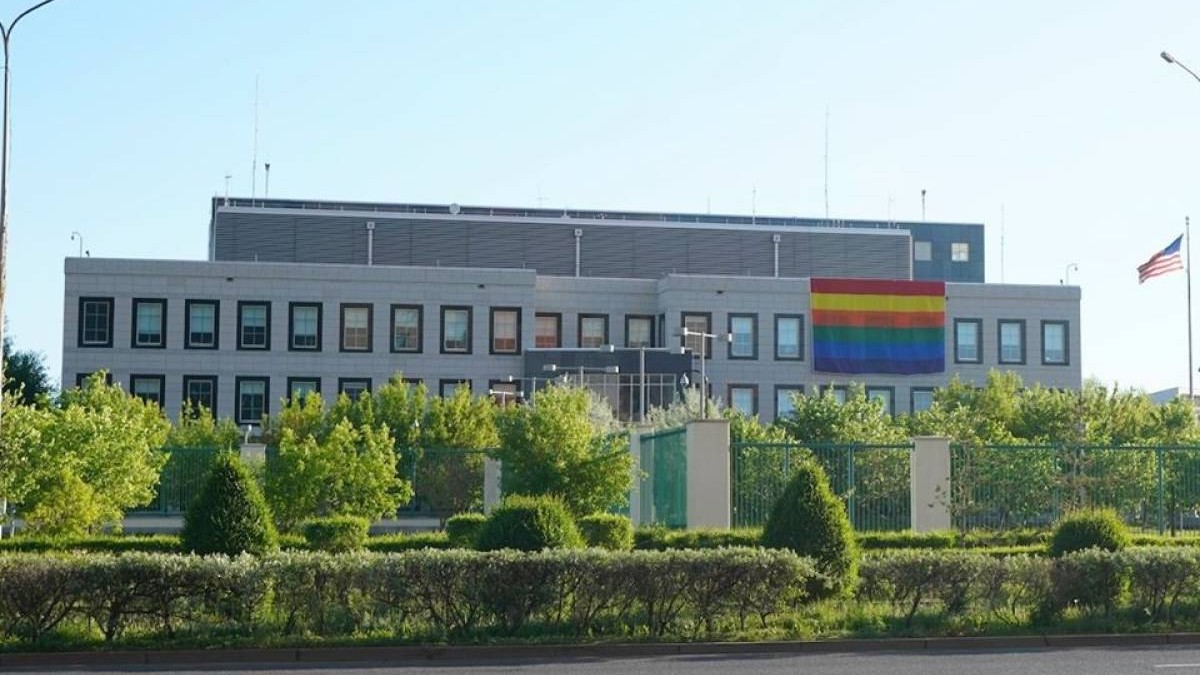 Қазақстандағы АҚШ елшілігінің ғимаратына ЛГБТ қауымдастығының туы ілінді. Тудың суреті ғаламторда жария болды.