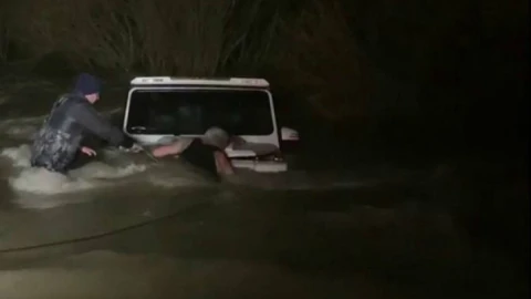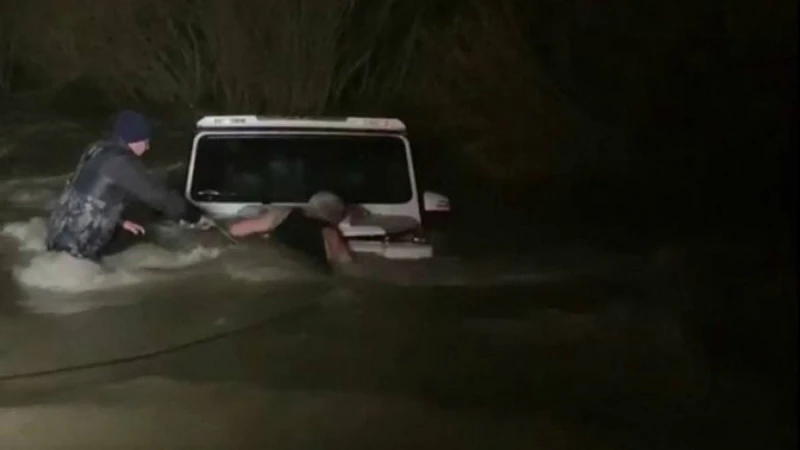 Автокөліктерге бекітілген тростардың көмегімен полицейлер мен еріктілер машинаны судан тартып, жүргізушіге өмірін сақтап қалды.