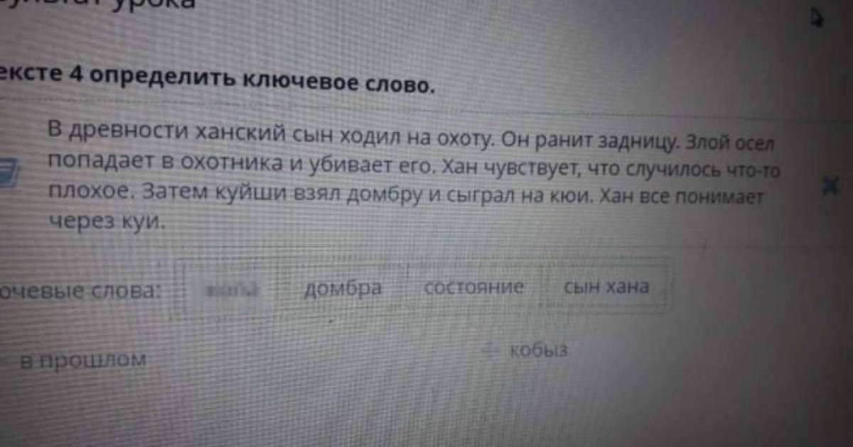 “Мәтіндегі төрт негізгі сөзді анықта. Ертеде ханның ұлы аң аулауға шығады. Ол бір құланды жаралайды. Ызалы құлан аңшыға тап беріп, оны өлтіреді. Хан бір жамандықтың болғанын сезінді. Сол кезде бір күйші домбырсын алып, күй тартады. Хан күй арқылы бәрін түсінеді”, – делінген қазақ тіліндегі нұсқада.