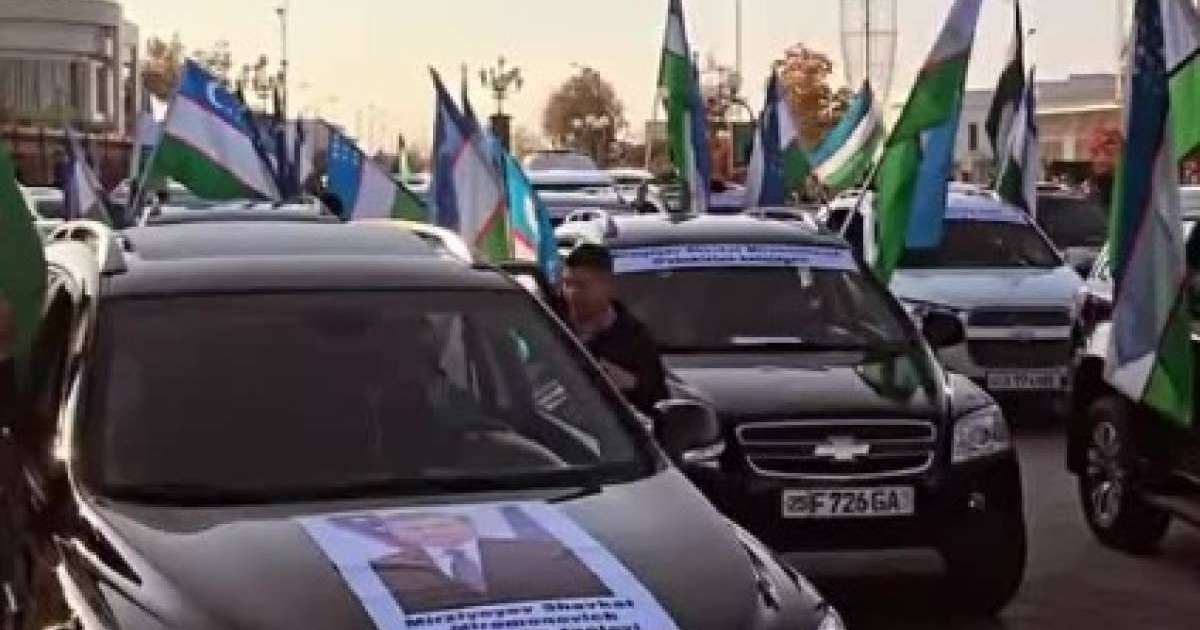 Бейнежазбадан өзбектердің өз президенттерінің портретін алып шыққанын көруге болады.
