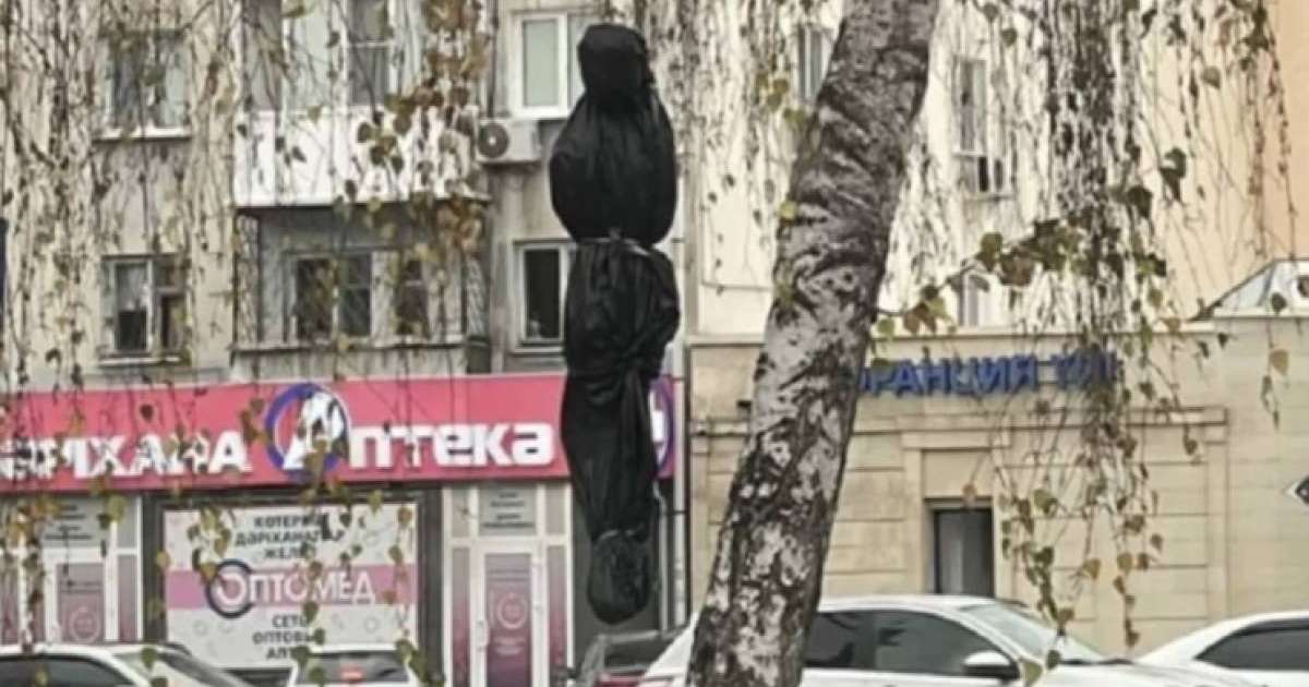 Әлеуметтік желілерде қала көшелеріндегі ағаштардың біріне ілінген, қара түсті пакетке оралған, адамға ұқсас белгісіз заттың суреті тарап кеткен еді.