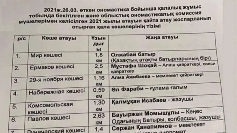 "26 наурыз күні өткен ономастика бойынша қалалық жұмыс тобында бекітілген және облыстық ономастикалық комиссия мүшелерімен келісілген 2021 жылы атауын қайта атау жоспарланып отырған қала көшелерінің тізімі" деп келтірілген құжатта.