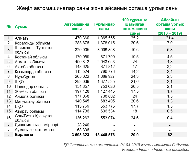Жүз тұрғынға шағылған автомашина саны бойынша, көшбасшысы – Алматы (25). Ал Қазақстанның ең «жүргінші» аумағы – Шымкент және Түркістан облысы. Мұнда, 100 тұрғынға бар болғаны 10 автомашина.