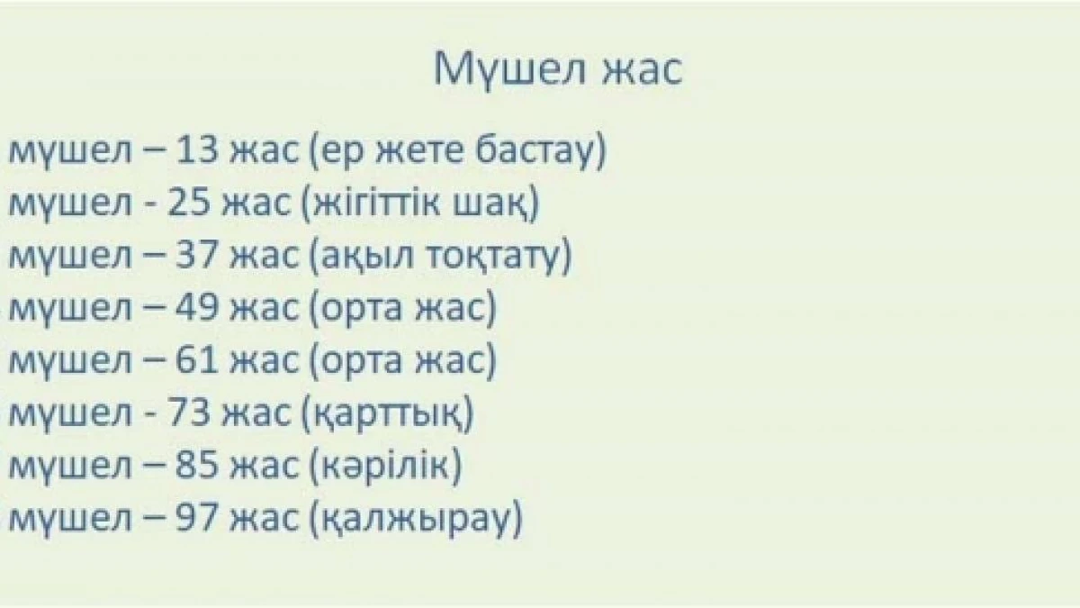 Бір мүшелде 12 жыл бар. Жыл қайыруда алғашқы туған жылы қайта оралғанда мүшелге толып отырады. Мүшел жас тақ жылдардан қайырылады, жұп жылдардан емес. Міне, қазақ осы есепті "мүшел қайыру" деп атайды. Қазақ әдеби тілінде жүзден асып, яғни тоғызыншы мүшелді толық жасаған атаны "арда ата", "ақ ата", "ару ата", "киелі ата" деп атайды. Осындай жасқа толған ананы "кейуана", "ақ апа", "әулие апа" деп атайды. Қазақтың ғұмыр туралы мына өлең жолдарынан өмірдің қалай өткенін көруге болады: Бір жаста жанып тұрған шырақтайсың, Дүниеге жаңа келіп тұрақтайсың. Қаз тұрып, тәй-тәй басып, былдыр сөйлеп, Құшағында ата-ананың бұлғақтайсың. Он жаста жарға ойнаған лақтайсың, Тай мініп, тайынша мініп жайтақтайсың. Он бес пен жиырманың арасында, Көрінсе қыз-келіншек ыржақтайсың. Жиырма бесте көкжал қасқырдайсың, Алдыңа не келсе де тайынбайсың. Жалындап жүрек отың махаббаттан, Ел аралап, ары-бері талтақтайсың. Отызда орда бұзып арындайсың, Қырықта қырқа асып жалындайсың. Елуде ерттеп мінген аттай болып, Кәріліктен еш белгі жоқ, шалынбайсың. Алпыс жаста сары белдің асуындай, Асылдың суы қайтқан жасуындай. Сабырың бекемделіп күн-күн сайын, Дарияның жылып аққан тасуындай. Жетпісте жер таянбай тұра алмайсың, Жастармен сауық-сайран құра алмайсың. Сексенде қара шашың қудай болып, Ауылдан алыс шығып жүре алмайсың. Тоқсаныңда тобықтай шал боларсың, Күніңе сексендегі зар боларсың. Қырандай жас кездегі қайран көзің, Көре алмай еш нәрсені қар боларсың. Кәрілікке ары-бері бұлғақтайсың, Ақ үрпек балапандай ырғақтайсың.