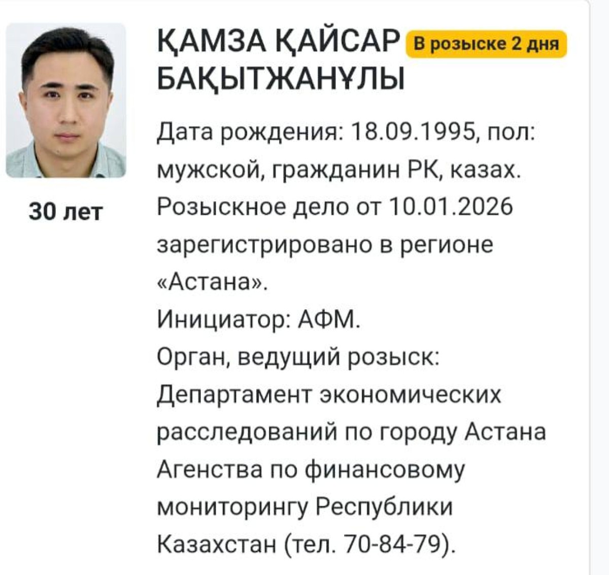 Порталда жарияланған ақпаратқа сәйкес, іздеуде Қамза Қайсар Бақытжанұлы тұр. Іздеудің екінші күнге жалғасып жатқаны көрсетілген, ал іздеу ісі 2026 жылғы 10 қаңтарда Астана өңірінде тіркелген. Блогердің туған күні ретінде 1995 жылғы 18 қыркүйек көрсетілген.