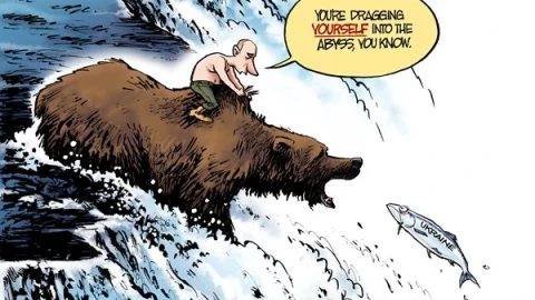 «Қазіргі Ресей жараланған аюға ұқсайды, әлі де күші бар, бірақ өте ашулы екен. Бұны кем дегенде жиырма жыл бұрын түсінуге болады?», - деп ол айтты. Автор Ресейді КСРО-ның уақытымен емес, патшалық Ресей кезеңмен салыстырады, Путинді орыс патшасы деп атайды, Кремльдің «ескі бекінісіндегі» және «эполет» киген орыс солдаттары Штюрмерге теартдағы қойлымды еске салады.