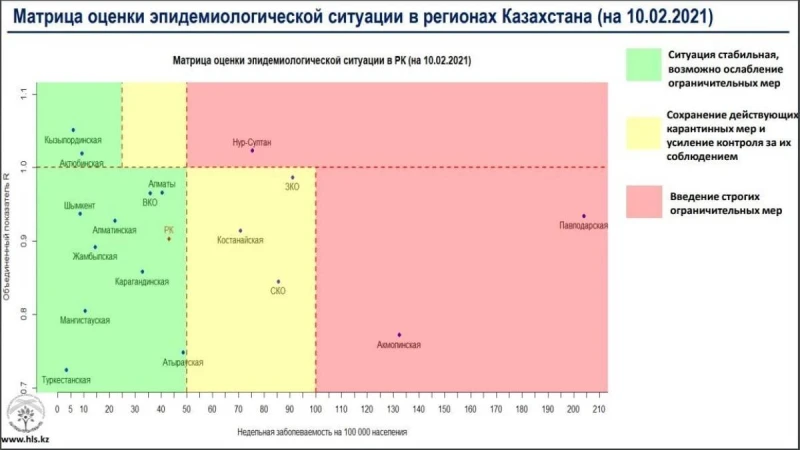 2021 жылғы 10 ақпандағы Қазақстан өңірлеріндегі эпидемиологиялық жағдайды бағалау матрицасы жарияланды.