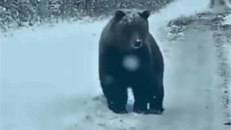 Видеода қоңыр аю қар басқан жолмен кетіп бара жатқаны және оны түсіріп келе жатқан көліктен мүлде үркімегені көрсетілген.