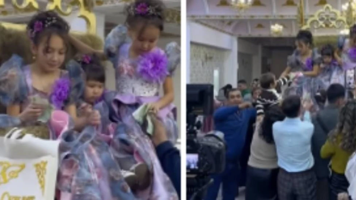 Видеода үш қыз баласының «сүндет той» деп жазылған қоржынға ақша жинап жатқаны анық көрініп тұр.