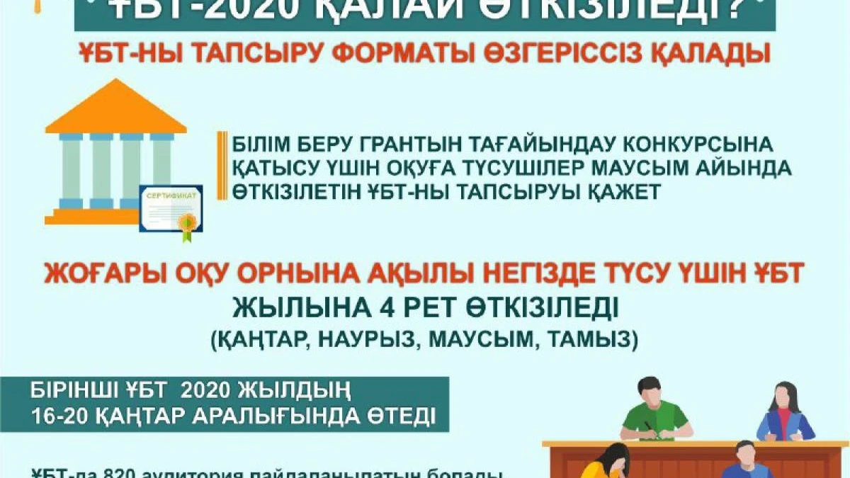 2020 жылғы 16-20 қаңтар күндері еліміздің барлық аймағындағы 99 тест тапсыру орындарында Ұлттық бірыңғай тестілеу өткізілуде.