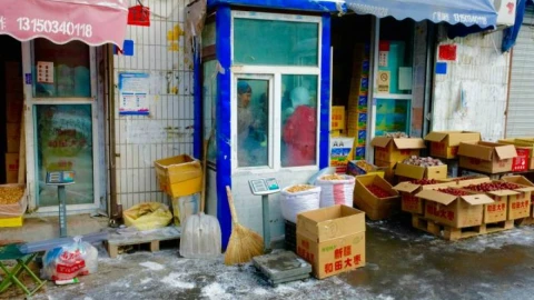 Жергілікті дүкеннің иесі тауарымен бірге сырғып барады. Арғы жақта президент Си Цзипин мен оның әйелінің портреті.