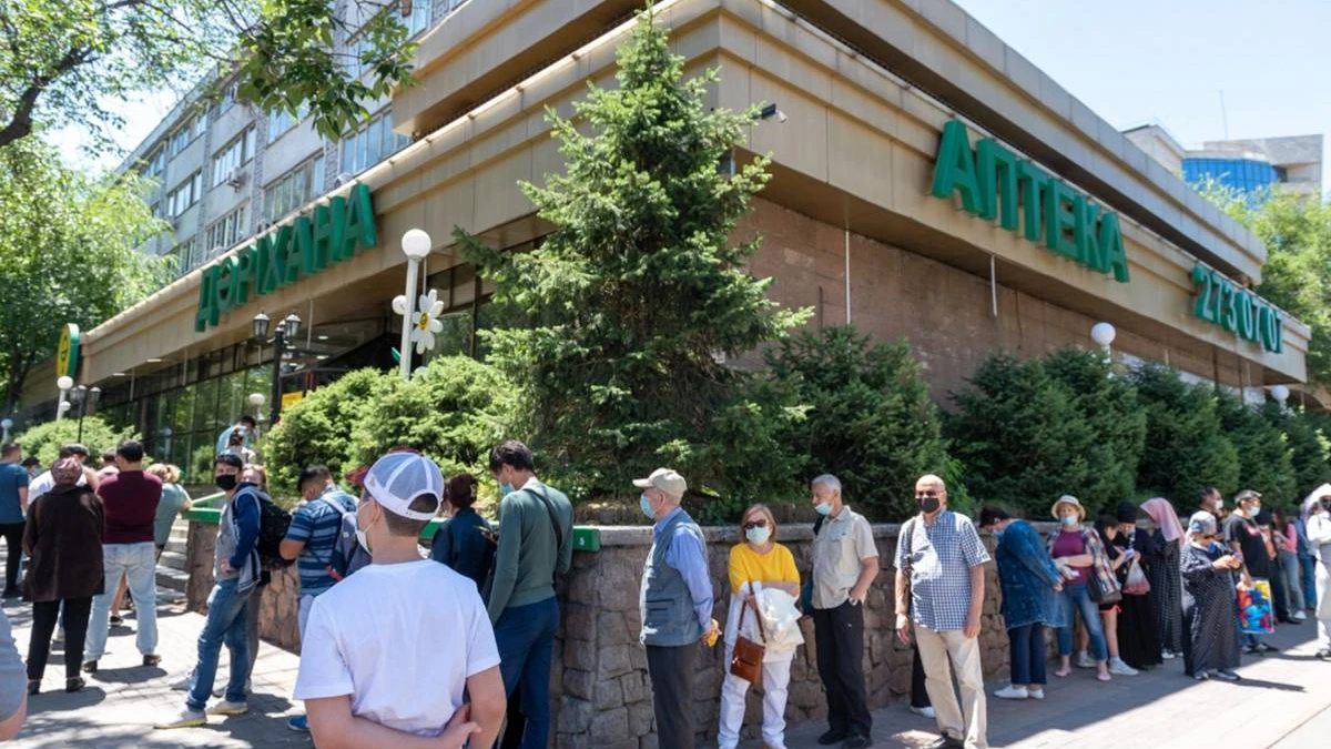 Алматының елуден астам тұрғыны метрополияның орталық дәріханасының жанында антипиретикалық және вирусқа қарсы препараттарды сатып алу үшін кезекке тұрды.