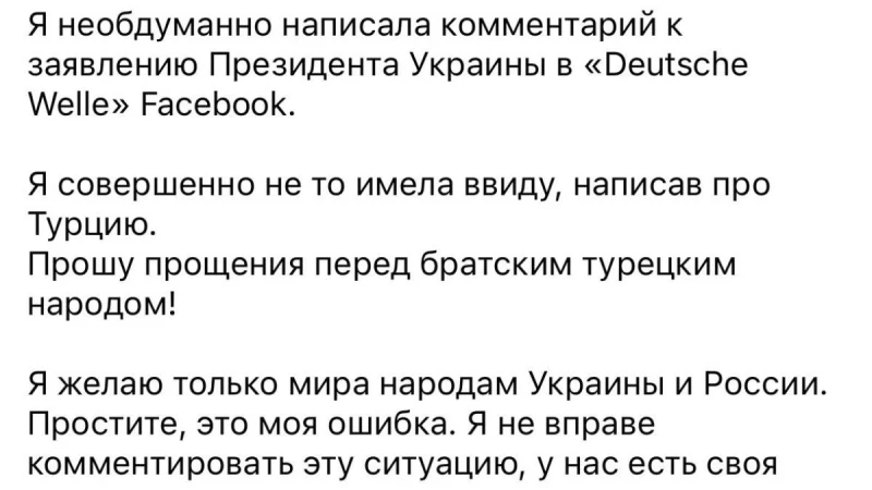 "Мен Украина Президентінің Facebook-тегі "Deutsche Welle" мәлімдемесіне пікір жаздым. Мен Түркия туралы қате айттым. Бауырлас түрік халқынан кешірім сұраймын. Мен тек Украина мен Ресей халықтарына бейбітшілік тілеймін. Кешіріңіз, бұл менің қателігім. Мен бұл жағдайға түсініктеме беруге құқығым жоқ, біздің өз еліміз бар, мен депутат ретінде ең алдымен оның әл – ауқаты туралы ойлануым керек", - деп атап өтті Башинская.