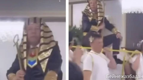 Ernur.kz хабарлауынша, видеодан жасы елуді алқымдаған белгісіз азаматтың Мысыр патшасы Перғауын бейнесіндегі киімді киіп алып, темір таққа отырып, тойхананың төріне кіргенін байқауға болады. Оны арнайы киімдегі адамдар көтеріп кірген, ал жан-жағында мысыр патшайымдары образыме киінген қыз-келіншектер қоршап, қошеметпен күтіп алған.  Бұл көрініс «Инстаграмда» қызу талқыға түсті. Желі қолданушылары бұл мерейтойдың осыдан 2-3 ай бұрын Жаңаөзен қаласында өткенін айтты.