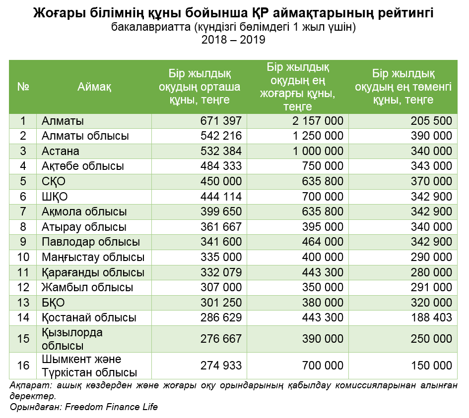 Қазіргі уақытта елімізде 124 жоғары оқу орны жұмыс істейді, олардағы оқу құны айтарлықтай қатты өзгешеленеді. «Freedom Finance Life» өмірді сақтандыру компаниясының мамандары ашық көздерден және қазақстандық жоғары оқу орындарының қабылдау комиссияларынан алынған деректерді талдап, бакалавриатта бір жылғы оқу құны бойынша ҚР аймақтарының рейтингін құрастырды.